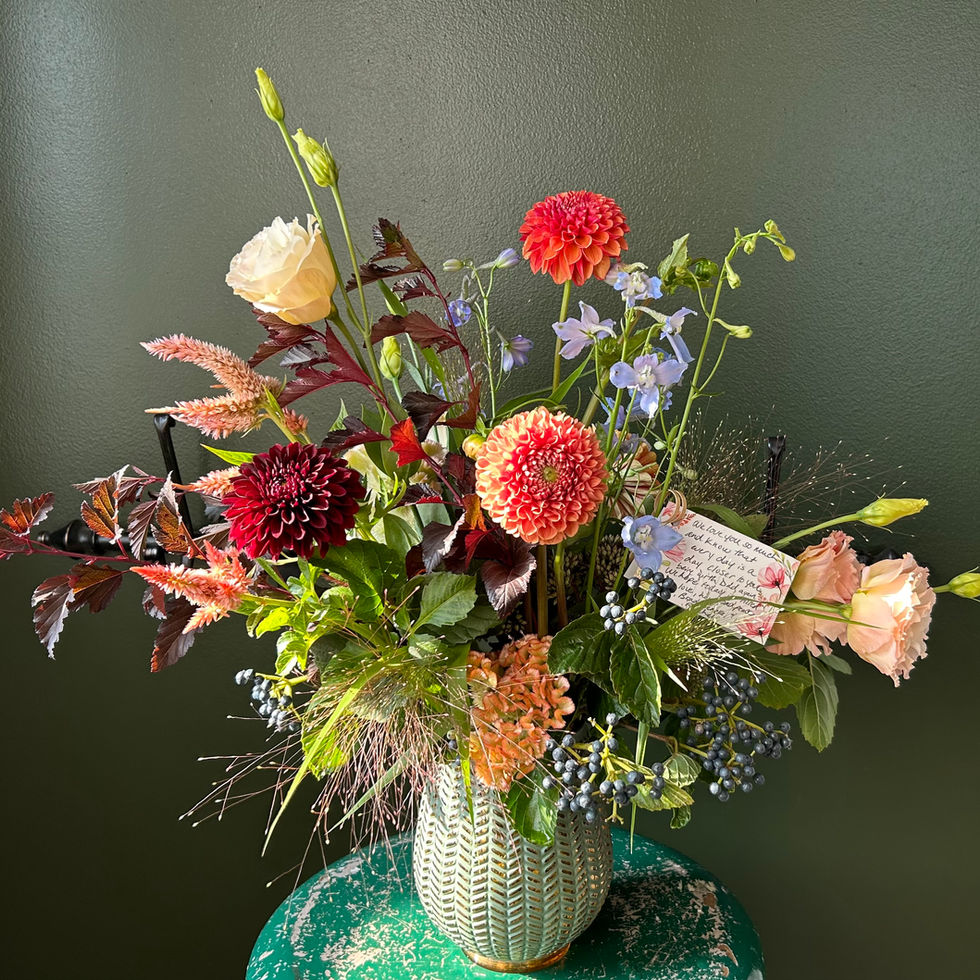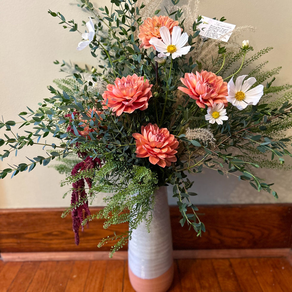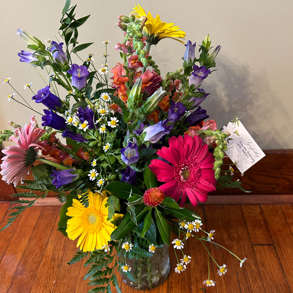 Fresh Arrangment with locally grown blooms, colorful mixed arrangement, all around style